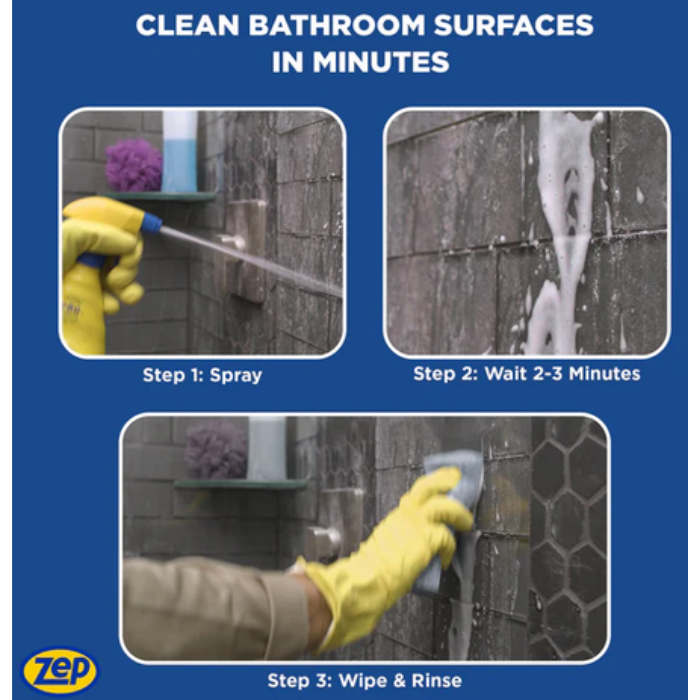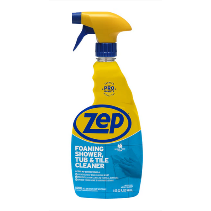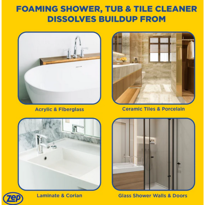 Zep 32 oz. Commercial Power Foam Tub & Tile Cleaner is a powerful foaming cleaner that quickly breaks down tough soap scum, calcium deposits, lime scale, and other grime without the need for scrubbing. Its advanced formula penetrates deep into surfaces, making cleaning easy and efficient. With a refreshing morning rain fragrance, it leaves your bathroom surfaces smelling fresh and clean.